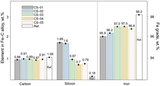 According to Figure 10, a graph shows a comparison between the primary impurities and the grade of Fe present in the steel that was formed during the experiments, and this is in relation to the Ref. results obtained from the previous experiment. The carbon content in the steel produced in the Ref. experiment was measured at 1.08%, while the steel produced during this experiment with the use of copper slag had an average carbon content of 0.9%, thus being 0.1% less. This indicates that the copper slag’s impurities may have been more involved in iron reduction. The copper content found to be dissolved in the steel samples from this particular experiment varied from 0.3% to 0.4%, as a specific example. Although the Si content of the steel showed some inconsistency, it was found to be considerably greater than the reference value across all observed instances. The Fe grade in the steel during this experiment was found to be a maximum of 97.0%, which was a lower value when compared to the Ref. results.