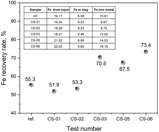 The Fe recovery level from copper slag, which is found in the Fe–SiO2 system, was the subject of an evaluation. The presence of FeO, serving as an oxygen carrier for elements, has a higher oxidation potential, which caused a reduction in Fe, allowing for its transfer to molten steel, which subsequently improved the overall steel yield. In addition to the other advantages, taking iron from magnetic and copper slags raises the level of economic value. In Figure 11, a graph is presented to compare Fe recovery when using additional oxidant and slag-forming materials, as well as the corresponding mass balance calculation data. It has been observed that the recovery of iron from slag during smelting with copper slag could potentially surpass 50% with prolonged holding times, and theoretical assessments propose that the extraction of iron could achieve up to 70% when smelting with copper slag and Fe2O3 additives.