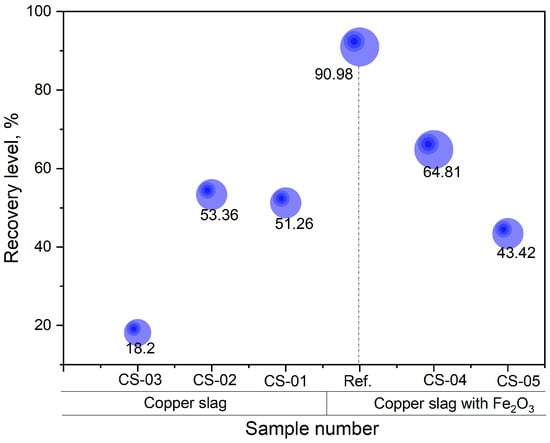 Nd recovery rates are compared in Figure 12. This evaluates the efficiency of Nd extraction from molten steel using copper slag, based on smelting holding time. With Ref. synthetic fayalite slag in the previous test, 90.98% of the Nd was extracted from the molten metal when 30 wt.% of fayalite flux and 2 wt.% of Fe2O3 were added for 30 min. While the smelting process was underway, observations revealed that when the holding time was just 10 min, the magnetic fraction did not completely melt; instead, it was present in the metal. When holding times are longer than 20 min, the magnet parts completely melt, which leads to an improved extraction of Nd. This is clearly illustrated by the recovery level: 18.2% for the CS-03 sample (10 min), and 53% and 51% for the CS-02 and CS-01 samples in that order. By adding Fe2O3 as an extra oxygen carrier prior to smelting, the recovery level increased (CS-4), ultimately reaching a value of 64.81%. With this experiment, the use of copper slag for Nd extraction reached a peak extraction degree of approximately 65%, which seems considerably less than the findings from prior experiments where modeled synthetic fayalite flux was used.
