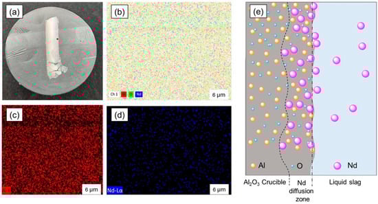 Analysis of the REE diffusion zone in the aluminum crucible interacting with slag. (a) The part of the Al2O3 crucible in reaction with slag, showing REE diffusion in nearly half of the sample–crucible wall, SEM-EDS analysis performed at the red point; (b) EDS mapping image; (c) Al distribution; (d) Nd distribution; (e) schematic of the Nd diffusion mechanism in the Al2O3 crucible wall.