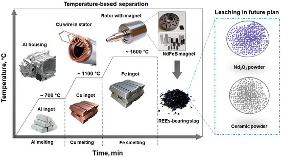 - Urtnasan, E.; Park, J.-H.; Chung, Y.-J.; Wang, J.-P. Pyrometallurgical Recycling of Electric Motors for Sustainability in End-of-Life Vehicle Metal Separation Planning. Processes 2025, 13, 1729. [Google Scholar] [CrossRef]
