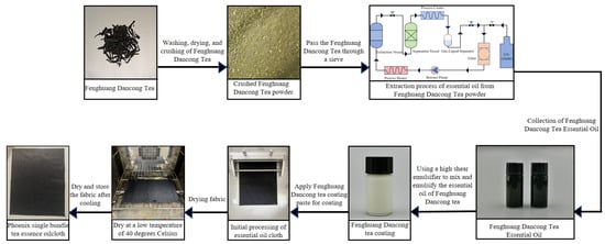 Process flow of SC-CO2 extraction and fabric coating using Phoenix Dancong tea essential oil.