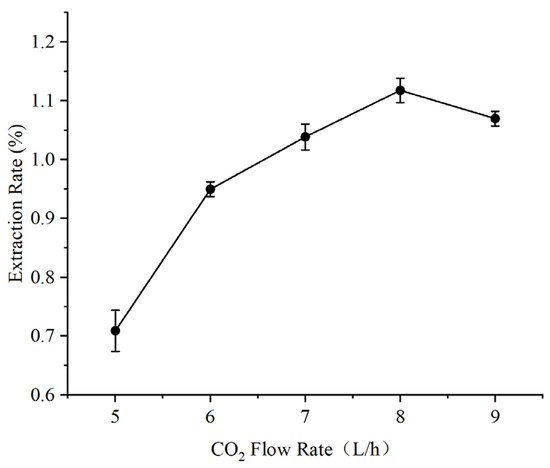 As shown in Figure 4, the highest yield was obtained at a CO2 flow rate of 8 L/h. This indicates that at this flow rate, a balance was achieved between the positive effect of improved solute–solvent interaction and the negative effect of reduced contact time, leading to an optimized extraction outcome. Overall, although increasing CO2 flow rate improves yield to a certain extent, the marginal benefit diminishes beyond a threshold, resulting in a plateauing trend in extraction efficiency.