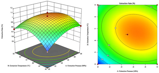The coefficient of determination (R2) and adjusted R2 were 0.9549 and 0.8969, respectively (Table 3), further confirming the model’s high explanatory power. The order of significance for the main factors is as follows: extraction pressure > CO2 flow rate > extraction temperature. Specifically, extraction pressure and CO2 flow rate had highly significant effects on yield (p < 0.01), while extraction temperature had a significant effect (p < 0.05). Moreover, the interaction between extraction pressure and CO2 flow rate, as well as between extraction pressure and temperature, was significant, whereas the interaction between CO2 flow rate and temperature was not.