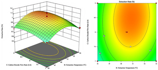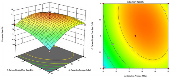 Figure 8 shows the combined effect of extraction temperature and CO2 flow rate on the extraction rate. The response surface indicates an optimal region near 50 °C and 8 L/h where the extraction yield peaks. Elliptical contour lines confirm a moderate interaction between the two factors, supporting the RSM model prediction.