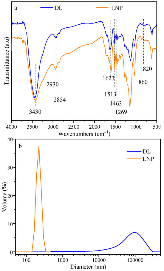 (a) FTIR spectra and (b) particle size distributions of DL and LNP.