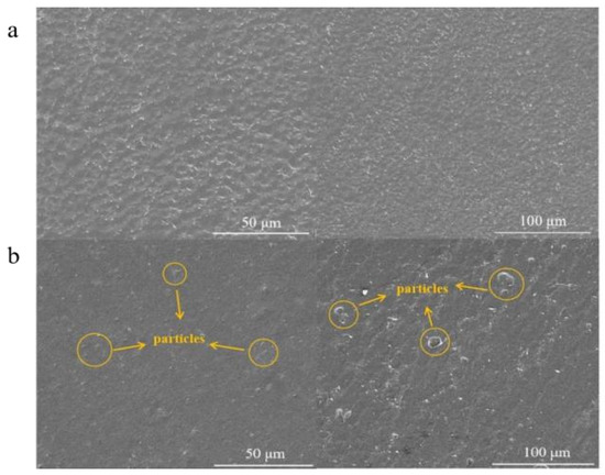 The morphologies of PBAT and PBAT/LNP-8 were observed by SEM, and the results are shown in Figure 4. According to Figure 4a, the surface of PBAT was relatively smooth and flat with a continuous homogeneous phase. After incorporating LNP, the surface of the PBAT/LNP-8 composite still remained smooth (Figure 4b), indicating the uniform dispersion of LNP in PBAT without obvious agglomeration and good compatibility between PBAT and LNP. This can be ascribed to LNP has high stability and good biocompatibility [14]. Therefore, it is reasonable to conclude that the addition of LNP may enhance the comprehensive properties of the composites. However, Figure 4b also showed the presence of particles on the surface of PBAT/LNP-8 and slight differences in the morphologies at various magnifications, suggesting that the dispersion of LNP in PBAT can be further improved.