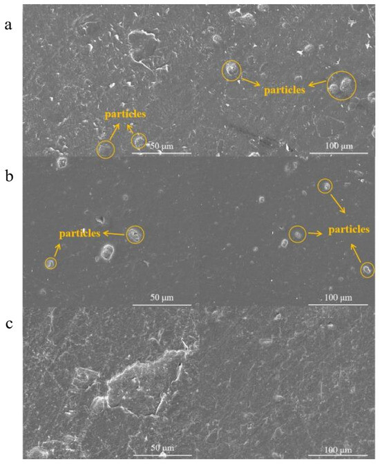 The morphologies of the PBAT/LNP-8 composite and its degraded samples are shown in Figure 5. After degradation for 30 d, the surface of the composite became rougher (Figure 5a). It can be ascribed to the degradation of PBAT and LNP in the presence of microorganisms in soil, as the results of IR in Figure 2b and XRD in Figure 3b. Additionally, the particles on the surface of the composite became more obvious, suggesting that PBAT and LNP had different degradation rates. According to Figure 5b, after degradation for 60 d, the surface of the PBAT/LNP-8 composite, contrarily, became smoother. However, obvious holes can be observed, which may be caused by a higher degradation rate of LNP on the surface of the composite. Since LNP doped in the PBAT matrix degraded first, which promoted the formation of the holes. Figure 5c showed that almost no particles appeared on the surface of the composite after degradation for 90 d, indicating complete degradation of LNP.