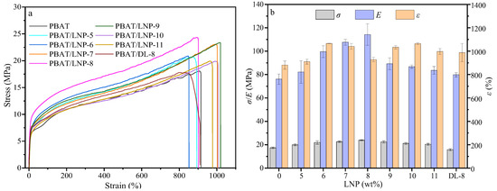 (a) Stress–strain curves and (b) mechanical properties of PBAT and PBAT/LNP composites.
