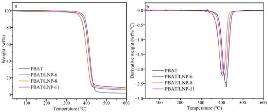 The TGA-DTG curves of PBAT and its composites are shown in Figure 7. According to Figure 7a, the thermal decomposition of PBAT began around 300 °C. The main weight loss occurred in the range of 350 °C to 475 °C, giving a weight loss of 95.80 wt%. The main weight loss of the PBAT/LNP composites occurred in the range of 320 °C to 460 °C, and a slight decrease in the weight loss was observed with increasing LNP content. The weight loss of PBAT/LNP-6, PBAT/LNP-8, and PBAT/LNP-11 was 90.24 wt%, 89.32 wt%, and 88.09 wt%, which were lower than that of PBAT. Therefore, the residuals of the PBAT/LNP composites increased with increasing the content of LNP. The residual amounts of PBAT, PBAT/LNP-6, PBAT/LNP-8, and PBAT/LNP-11 were 1.64 wt%, 5.88 wt%, 6.15 wt%, and 8.23 wt%, respectively. This is due to the high carbon content of lignin [45]. The DTG curves in Figure 7b showed that the maximum pyrolysis temperature of PBAT was 420 °C, and the maximum pyrolysis temperatures of PBAT/LNP composites varied in the range of 402 °C to 411 °C, indicating that the thermal stability of the composites was insignificantly affected by the addition of LNP. Surprisingly, the maximum pyrolysis temperatures of the PBAT/LNP composites were closer to that of PBAT with the increase in the content of LNP. The maximum pyrolysis temperatures of PBAT/LNP-6, PBAT/LNP-8, and PBAT/LNP-11 were 402 °C, 404 °C and 411 °C, respectively. This may be due to the fact that the intramolecular and intermolecular hydrogen bonding (Figure 2a) and π-π interactions were enhanced with increasing the LNP content in the composites [45]. It caused the agglomeration of LNP, and higher energy was required to disrupt intermolecular interactions [13]. Therefore, the maximum pyrolysis temperature of PBAT/LNP composite gradually increased with the increase in the LNP content.