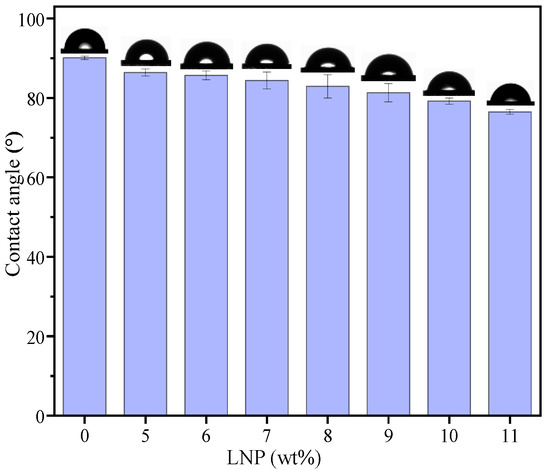 Figure 8 shows the WCA of PBAT and its composites. Since PBAT was hydrophobic, a WCA of 90.1° was observed. It is well-known that hydroxyl groups and ester groups are contained in LNP and PBAT, respectively, and they form intermolecular hydrogen bonds [34,35], as shown in Figure 2. Therefore, the hydrophilicity of the composites was improved due to the addition of LNP, increasing with the increase in the content of LNP. The WCA of the composites decreased from 86.4° to 76.5° with increasing the content of LNP from 5 wt% to 11 wt%.