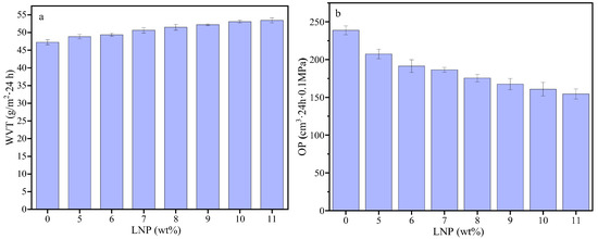 Figure 9 shows the gas barrier properties of PBAT and its composites. The WVT of PBAT was 47.24 g/(m2·24 h), and the WVT of the composites was enhanced after the addition of LNP (Figure 9a). Moreover, the WVT of the composites increased with increasing the content of LNP in the range of 5 wt% to 11 wt%. It was enhanced from 48.83 g/(m2·24 h) to 53.44 g/(m2·24 h). The results further indicated that the addition of LNP improved the hydrophilicity of the composites, which was in agreement with the results of WCA in Figure 8. According to Figure 2, the hydrophilic hydroxyl groups in LNP promoted the formation of hydrogen bonds in the PBAT/LNP composite. As a result, the interaction between the composite with water molecules was enhanced, facilitating the diffusion of water and improving the hydrophilicity of the composite.