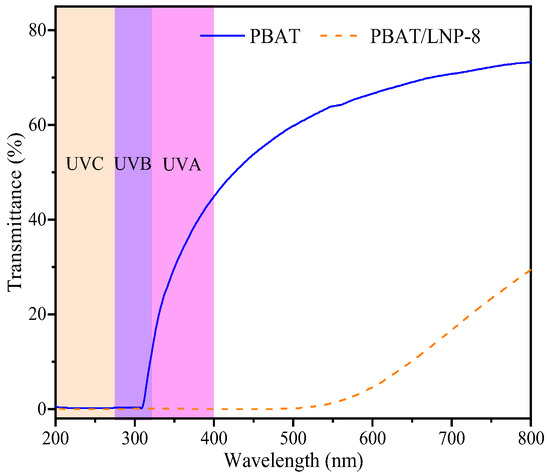 UV-blocking performance of PBAT and PBAT/LNP-8.