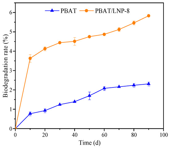 The biodegradation of PBAT and PBAT/LNP-8 was performed by the soil burial biodegradation test, and the results are shown in Figure 11. Due to a few microorganisms that can degrade PBAT in soil [46], the degradation of PBAT was slow, and only a 2.31% biodegradation rate was observed after 90 d. The addition of LNP improved the biodegradation rate of PBAT/LNP-8 composite. The degradation rate was enhanced to 5.83%, which was 2.52 times higher than that of PBAT. It can be attributed to two factors. Combining Figure 3b and Figure 4, it was evident that the degradation of LNP was easier than that of PBAT. Additionally, the breakage of the ester bond of PBAT led to the formation of new hydroxyl sites. It enhanced the water absorption capacity of the composite (Figure 2b) during the degradation, thus further accelerating the degradation of PBAT and enhancing the biodegradation rate.