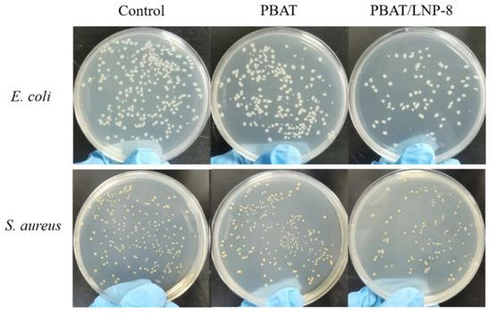 The antibacterial properties of PBAT and PBAT/LNP-8 composite were investigated, and the results are shown in Figure 12. The colony numbers of E. coli and S. aureus in the PE group were comparable to those of the control group, indicating that PBAT hardly had any antibacterial property. However, the colony numbers of E. coli and S. aureus in the PBAT/LNP-8 group were significantly less than those of the control group, suggesting that the incorporation of LNP effectively enhanced the antibacterial property of the composites. It is ascribed to the fact that polyphenols caused damage in the cell wall via lysis, resulting in the leakage of the internal fluid [49]. Furthermore, there were numerous reactive oxygen species. They were absorbed by the polyphenol compounds, aggregating on the surface of LNP because of its high anti-oxidation behavior. It could release and induce oxidative stress by altering the normal redox physiological process through contacting the bacteria [50].