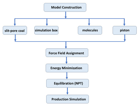 Molecular dynamics simulations were performed using Gromacs version 5.0.7. The simulation process is shown in Figure 1. A slit-pore model was constructed to represent the coal matrix, consisting of two parallel graphene sheets. The coal matrix was modeled as parallel graphene sheets, which is a widely adopted simplification in molecular simulations of coal–gas systems. This approach effectively captures the essential π–π interactions and adsorption characteristics of the coal aromatic structure. However, this model does not fully capture the chemical and structural heterogeneity of real coals. Examples include cross-linked macromolecular networks, mineral inclusions, and oxygen-containing functional groups. Therefore, the results should be interpreted as reflecting the intrinsic adsorption and displacement behaviors on idealized carbon surfaces rather than the complete complexity of natural coal matrices. The lateral dimensions of each graphene sheet were fixed at 10.8 nm × 5.68 nm, and the sheets were positioned to form a uniform slit pore. The overall simulation box was set to 45 nm × 5.68 nm × 6.18 nm, with sufficient vacuum regions at both ends along the x-direction to eliminate artificial interactions between periodic images [24]. The pore space between the two graphene sheets was initially filled with 8175 water molecules and 2000 CH4 molecules, representing the in situ coalbed methane (CBM) environment. On the left side of the pore, 800 carbon dioxide (CO2) molecules were placed to simulate CO2 injection. An additional graphene sheet was fixed at the far-left boundary, which was employed as a movable piston to apply external pressure and drive the CO2 molecules toward the coal pore, thereby mimicking the displacement of CH4 by injected CO2 (Figure 2). The piston was gradually advanced to achieve target pressures of 15 Mpa, 20 Mpa, and 25 Mpa, corresponding to typical subsurface conditions for enhanced coalbed methane (ECBM) recovery [25,26]. Periodic boundary conditions were implemented along all three axes, with the vacuum layers ensuring that the CO2 injection process occurred without interference from image molecules. This configuration enabled direct investigation of the competitive adsorption and displacement behavior of CO2 and CH4 in confined environments, as well as assessment of CH4 recovery efficiency at different injection pressures.