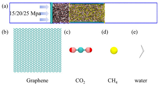 (a) The initial structure diagram of carbon dioxide displacement of coalbed methane; structural diagram of (b) coal seam, (c) carbon dioxide, (d) CH4, and (e) water.