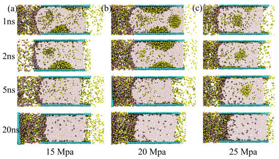 The structural evolution of CH4 driven by CO2 under driving pressures of (a) 15 Mpa, (b) 20 Mpa, and (c) 25 Mpa.