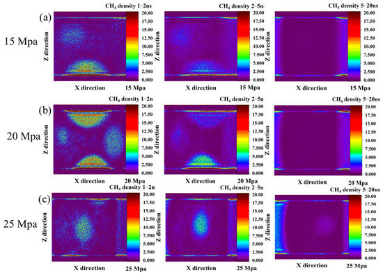 The temporal evolution of methane distribution under different driving pressures was examined using two-dimensional (2D) density contour maps. These maps were averaged over three time intervals: 1–2 ns, 2–5 ns, and 5–20 ns. These maps illustrate the spatial migration and phase behavior of methane during CO2-driven displacement.