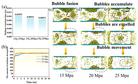 (a) The retention time of methane on the coal seam surface under different driving pressures; (b) the variation in the number of methane molecules desorbed from the coal seam surface over time under different driving pressures. Dynamic evolution of methane bubbles under driving pressures of (c) 15 Mpa, (d) 20 Mpa, and (e) 25 Mpa.
