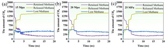 The variation in the number of retained methane, released methane, and lost methane molecules over time under the driving pressure of (a) 15 Mpa, (b) 20 Mpa, and (c) 25 Mpa.