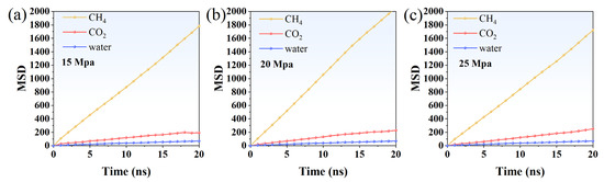 MSD of CH4, CO2, and water under driving pressure of (a) 15 Mpa, (b) 20 Mpa, and (c) 25 Mpa.