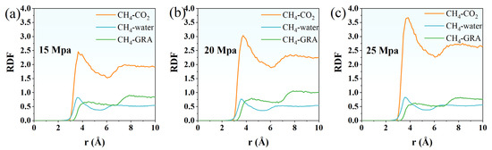 RDF of CH4-CO2, CH4–water, and CH4-GRA under driving pressure of (a) 15 Mpa, (b) 20 Mpa, and (c) 25 Mpa.