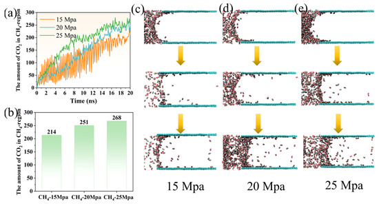 (a) The variation of the amount of CO2 entering the CH4 coverage area over time; (b) the amount of CO2 that eventually enters the CH4 coverage area under different driving pressures. Dynamic structural evolution of CO2 at (c) 15 Mpa, (d) 20 Mpa, and (e) 25 Mpa.