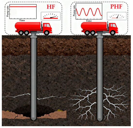 Schematic comparison of conventional hydraulic fracturing (HF) and pulse hydraulic fracturing (PHF).