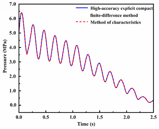 This problem is solved using an explicit compact finite-difference scheme with sixth-order spatial accuracy and second-order temporal accuracy, while the conventional transient flow Equation (9) is solved using the method of characteristics; the results obtained by the two methods are compared.