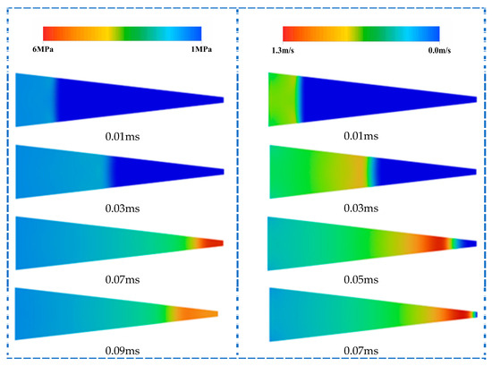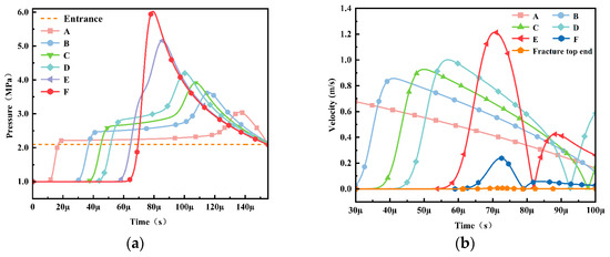 Using the boundary and initial conditions given in Section 2.3, the problem is solved with the high-accuracy finite-difference method. A pressure with a peak value of 2 MPa is injected; the pulse frequency is 100 Hz; the time is divided into 1000 steps with a step size of 0.0001 ms. Seven cross-sections are set at the inlet, 25 mm, 50 mm, 60 mm, 70 mm, 90 mm, and 98 mm as monitoring sections, denoted as Inlet and A–F, respectively. Line plots of the pressure-wave propagation characteristics and velocity within the fracture are shown in Figure 4.