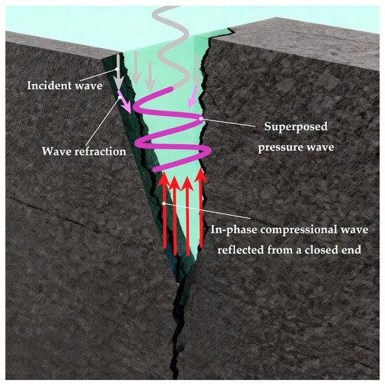 Schematic of pressure-wave convergence, superposition, and amplification at a wedge-shaped fracture tip.