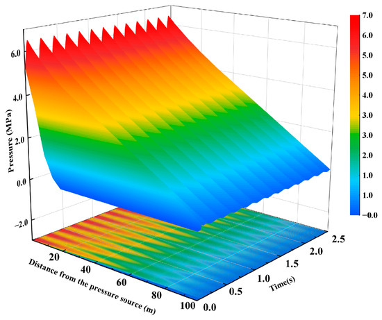 In reality, pressure waves propagating in the fracture undergo attenuation due to the along-path friction. A 5 Hz sinusoidal injection pressure is prescribed, and using the high-accuracy explicit compact finite-difference method, the pressure distribution within the fracture as a function of time and fracture length is obtained, as shown in Figure 7: