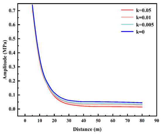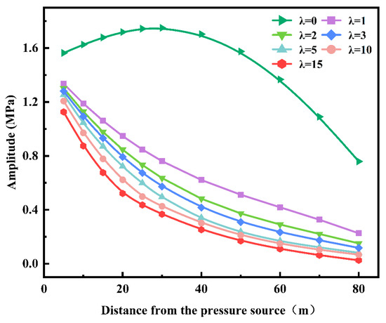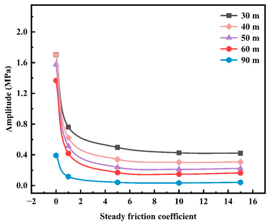 Figure 8 shows the variation in the pressure-wave amplitude with transmission distance for different steady friction coefficients. It can be seen that when the steady friction is zero, the pressure amplitude first increases and then rapidly attenuates. This is because, in the absence of friction, when the bottomhole treatment pressure exceeds the pressure at the fracture front and the system is at the critical state of extension, upon the arrival of the compression wave, a portion of the energy is used to extend the fracture; due to the pressure boundary condition, the pressure of the fracturing fluid at the front decreases, the density decreases, and an expansion wave with phase inversion—similar to the water-hammer phenomenon [31]—is generated. The phase difference causes the amplitudes of the compression wave and the expansion wave to superimpose at certain locations; in general, the amplitude is maximal at a distance of one-quarter wavelength from the front end. When the fracturing fluid is subjected to steady friction, the pressure-wave amplitude gradually decreases, exhibiting an approximately exponential decay trend; moreover, the greater the steady friction, the larger the attenuation rate of the pressure amplitude over 0–30 m. When the Darcy friction coefficient is 2, the pulse pressure amplitude is 0.63 MPa at 30 m and 0.15 MPa at 80 m, corresponding to 48.83% and 11.61% of the amplitude at 5 m, respectively. When the coefficient is 5, the amplitudes are 0.49 MPa at 30 m and 0.08 MPa at 80 m, which are 39.57% and 6.47% of that at 5 m. When the coefficient is 10, the amplitudes are 0.42 MPa at 30 m and 0.06 MPa at 80 m, corresponding to 35.29% and 5.57% of that at 5 m. This is because the initial flow velocity is high, and steady frictional resistance is proportional to the square of the velocity. Therefore, most of the mechanical energy is consumed in the near-wellbore region.