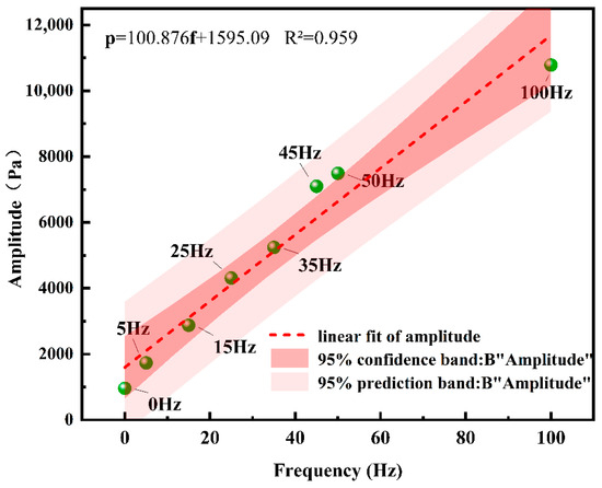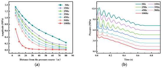 Figure 11 shows the result data under different frequency conditions. Timing and data acquisition commence after the pressure within the fracture has stabilized. In plotting Figure 11b, Y-axis values were offset to prevent overlap among the pressure-wave curves at different frequencies; the offset magnitude was determined by the pressure-wave amplitude. As the pulsing frequency increases, the along-path attenuation rate of the pressure-wave amplitude within the fracture increases accordingly; when the frequency exceeds 25 Hz, the pressure amplitude at 60 m is almost completely attenuated. When the frequency is 35 Hz, the pressure amplitude is attenuated by about 90% at 80 m of the crack. When the frequency is 50 Hz, the pressure amplitude at a distance of 80 m from the inlet has almost decayed to 0 kPa; therefore, selecting a high frequency cannot practically deliver the inherent advantages and intended effects of pulsed hydraulic fracturing.