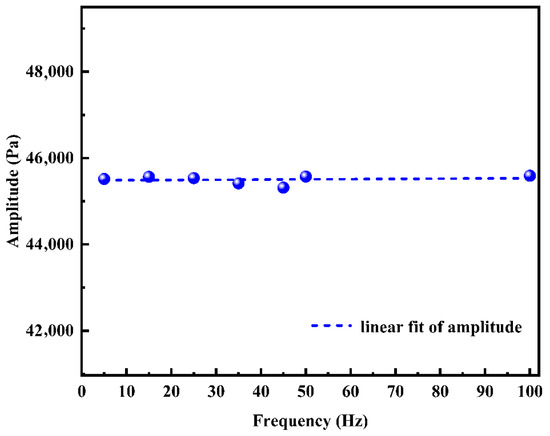 This is because unsteady friction is directly driven by the local acceleration of fluid micro-elements and the velocity gradient; the higher the frequency, the stronger the transient effects, and the greater the resulting unsteady resistance. Figure 12b presents the specific values of the steady friction pressure drop at different frequencies. Figure 13 shows the amplitude of the unsteady friction pressure drop at different frequencies. Figure 14 shows the amplitude of the steady friction pressure drop at different frequencies. It can be seen that the pressure amplitude of steady friction remains almost unchanged with increase in frequency, and the energy consumption of its single oscillation remains unchanged. However, the increase in the number of oscillations in the same time leads to faster continuous energy consumption, while the fluctuation amplitude of unsteady friction has a linear relationship with the increase in frequency. In physical terms, under high-frequency treatment conditions, the core flow velocity varies rapidly, preventing the boundary layer from fully developing. The no-slip boundary condition therefore yields a larger near-wall velocity gradient; according to Newton’s law of viscosity, the wall shear stress exhibits pronounced fluctuations that dissipate more energy. Moreover, high-frequency oscillations intensify turbulent fluctuations, increase the unsteady friction coefficient, and reduce the boundary-layer thickness, thereby increasing the degree of attenuation. In this case, the steady friction coefficient is 1 and the Brunone coefficient is 0.03. The following conclusions can be drawn: for larger steady friction coefficients, as the pulse frequency increases, pressure attenuation is dominated by the steady friction; for smaller steady friction coefficients, as the pulse frequency increases, pressure attenuation is dominated by the Brunone unsteady friction, because it increases linearly with frequency. The synergy of the two leads to the rapid attenuation of the amplitude of the continuous pulse pressure wave under high-frequency conditions.