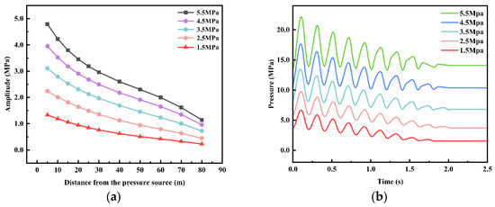From Figure 7, it can be seen that as the pulsed pressure wave propagates within the fracture, its amplitude attenuates along the fracture length; however, how various parameters affect the transmission–attenuation process has not been elaborated in detail, leading to certain uncertainties and room for optimization in the control of pulse parameters in field applications.
