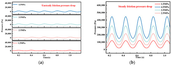 The friction pressure drop values at different frequencies. (a) Unsteady friction pressure drop at different frequencies; (b) Steady friction pressure drop at different frequencies.