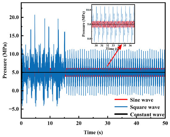 Pulsed pressure waves with different waveforms exhibit their own unique characteristics during propagation, which directly influence the generation and propagation of fractures, as well as the placement, migration, and conductivity of proppants. Therefore, studying the impact of different pulse waveforms on pressure waves can provide more accurate technical support for pulsed fracturing operations, ensuring the maximization of construction effectiveness and safety. Sinusoidal, rectangular, and steady input pressures are employed, with a frequency of 15 Hz and an amplitude of 1.5 MPa; all other parameters are held constant.