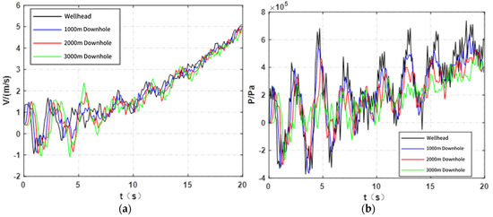 As shown in Figure 1a, during the start-up process, the flow velocity fluctuates approximately periodically with time, and the period strengthens with increasing time. The greater the flow velocity, the larger the fluctuation amplitude within 12 s after start-up, and the growth is relatively slow. After 12 s, the flow velocity fluctuation in amplitude decreases, the growth rate accelerates, and periodic changes become obvious. Figure 1b, shows the fluid pressure form during the start-up process fluctuates approximately periodically with time and shows an overall increasing trend. The fluid pressure fluctuation at the wellhead is large. As the well depth increases, the flow pressure fluctuation gradually weakens due to the friction effect of fluid flow. If the influence of static fluid column pressure is ignored, the fluid pressure in the tubing string can be expressed by.