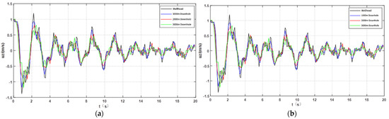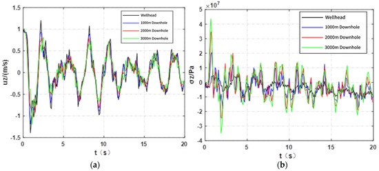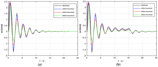 The influence of injection rates increasing from zero to 7 m3/h and 20 m3/h on the axial vibration velocity of the tubing string is shown in Figure 5. Figure 5a shows the positive and negative maximum values of axial vibration velocity of the tubing string appear at 2.2 s, 1.194 m/s, and 0.9 s, −1.382 m/s. Figure 5b shows that the positive and negative maximum values appear at 2.2 s, 1.206 m/s, and 0.9 s, −1.394 m/s. This indicates that the flow rate has little effect on the value and oscillation period of the axial vibration velocity.