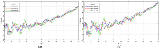 The influence of injection rates increasing from zero to 7 m3/h and 20 m3/h on the fluid velocity in the tube is shown in Figure 3. It shows that the fluid velocity form at the four sections fluctuates approximately periodically with the start-up time, and the period strengthens with increasing time. The greater the flow velocity, the larger the fluctuation. A small fluctuation occurs in the flow velocity within the first 2 s because the pump unit has not fully started, which has a greater impact on the flow rate. It should be noted that this proportional relationship is not purely linear. Affected by the periodic displacement output of the multi-cylinder plunger pump (Equation (7)), the flow velocity exhibits slight periodic fluctuations against the overall increasing trend (such as the fluctuations before 12 s as shown in Figure 4a,b). Additionally, as the well depth increases, the combined effect of fluid friction and gravitational component force causes a slight decrease in the slope of the flow velocity increase. Therefore, the relationship between flow velocity and displacement is closer to “quasi–linear”—that is, it shows proportionality macroscopically, while microscopically, nonlinear fluctuations exist due to the influence of transient operating conditions and spatial position. Figure 3a shows that as the well depth increases, the times for the flow velocity at each section to first reach the peak are as follows: 0.1 s, 0.4 s, 0.7 s, 0.9 s, and the corresponding fluid velocities are as follows: 1.347 m/s, 1.443 m/s, 1.51 m/s, 1.435 m/s. At 20 s after start-up, the flow velocity at the wellhead reaches 5.097 m/s, and at downhole 3000 m, it reaches 4.855 m/s. Figure 3b shows that the times for the flow velocity at each position in the tubing string to first reach the peak are as follows: 0.1 s, 0.4 s, 0.7 s, 0.9 s, and the corresponding fluid velocities are as follows: 2.15 m/s, 2.191 m/s, 2.217 m/s, 2.091 m/s. At 20 s after start-up, the flow velocity at the wellhead reaches 5.897 m/s, and at downhole 3000 m, it reaches 5.65 m/s.