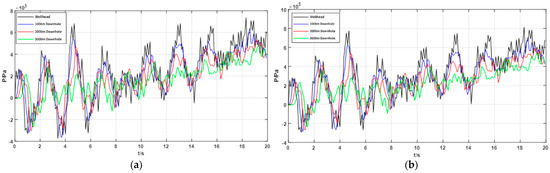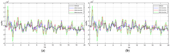 The influence of injection rates increasing from zero to 7 m3/h and 20 m3/h on the fluid pressure in the tube is shown in Figure 4. Affected by downhole pressure fluctuations, the flow pressure in the tube will superimpose, resulting in peaks and maximum values. As shown in Figure 4a, the flow pressure reaches a peak of 0.682 MPa at 4.7 s, a peak of 0.682 MPa at 13.1 s, and a maximum value of 0.736 MPa at 18.3 s. As shown in Figure 4b, the flow pressure reaches a peak of 0.775 MPa at 4.7 s, a peak of 0.748 MPa at 13.1 s, and a maximum value of 0.813 MPa at 18.3 s. That is, as the flow rate increases, the time for the fluid pressure to reach the extreme value remains unchanged, but the value increases.