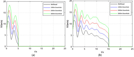 The influence of shutdown times of 5 s and 15 s on the axial vibration velocity of the tubing string is shown in Figure 9. Figure 9a shows that after 5 s of shutdown, due to the inertia of the tubing string itself, the vibration form still fluctuates, and it completely stabilizes at 16.4 s, taking 11.4 s. Figure 9b, shows that at 15 s shutdown, the vibration form graph drops sharply and gradually stabilizes, completely stabilizing at 22.8 s, taking 7.8 s. That is, as the shutdown time increases, the graph fluctuation becomes smoother, and the time from shutdown to complete stabilization is shorter.