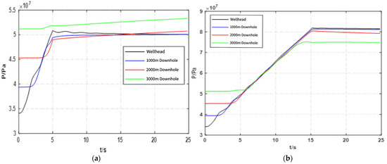 The influence of shutdown times of 5 s and 15 s on the fluid pressure in the tube is shown in Figure 8. Figure 8a shows that the difference between the initial and final fluid pressure at the wellhead is the largest, and it weakens sequentially with increasing well depth. However, due to the short shutdown time, the pressure wave has not been transmitted to downhole 3000 m, so the pressure fluctuation there shows no obvious change. Figure 8b shows that the fluid pressure at all sections of the tubing string is affected by the shutdown. The longer the shutdown time, the smaller the slope of the pressure increase. As the well depth increases, the difference between the initial and final fluid pressure becomes smaller, and the stable flow pressure value is lower.