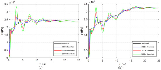 The influence of shutdown times of 5 s and 15 s on the additional axial stress of the tubing string is shown in Figure 10. Figure 10a shows that the value of axial additional stress of the tubing string in the graph finally stabilizes near 240 MPa. As shown in Figure 10b, the value in the graph finally stabilizes near 325 MPa.