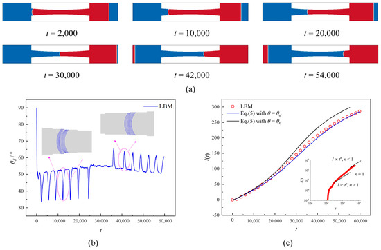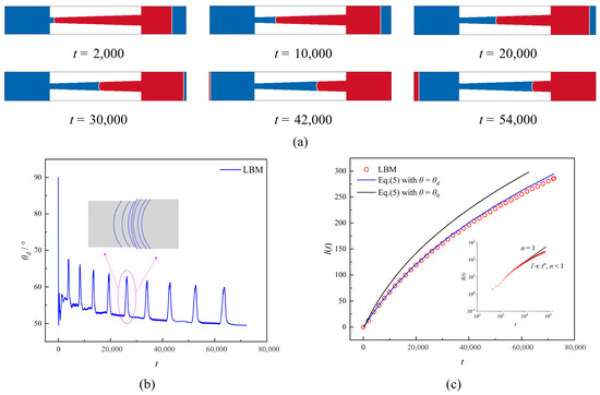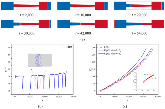 (a) Liquid–liquid spontaneous imbibition process at different time steps in the parabolic capillary. (b) Time evolution of contact angle during liquid–liquid spontaneous imbibition. (c) Theoretical imbibition length with and without considering the dynamic contact angle with LBM results.