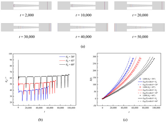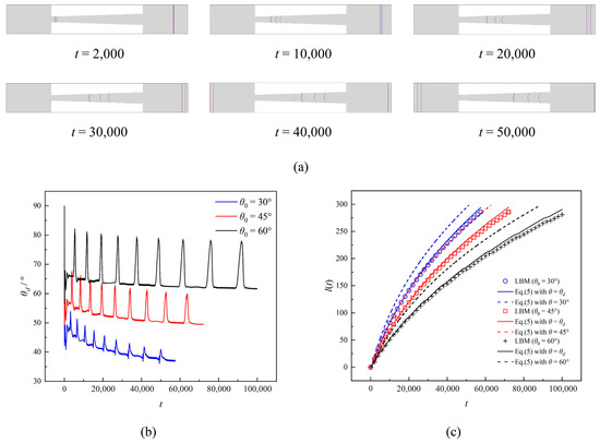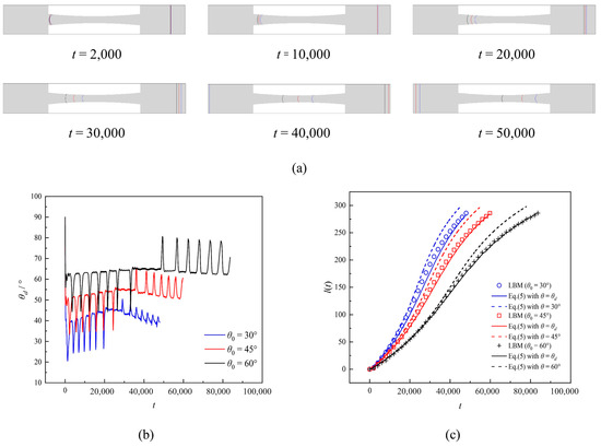 As for the monotonically divergent conical capillary, the meniscus profiles in the capillary with monotonically increasing axial width at different time steps are shown in Figure 4a. The distance between meniscus profiles for different θ0 in Case A is obvious at the initial time, which indicates that the inertial forces contribute relatively weakly to the capillary width with a small size. The imbibition length increased the axial width of the capillary gradually dispersion, resulting in a decrease in imbibition velocity and an increase in distance between the three menisci. This was particularly evident in cases where θ0 = 45° and θ0 = 60°. To better explain this phenomenon, we give the real-time evolution of the DCA θd and the imbibition length for three different θ0 conditions, as shown in Figure 4b,c. One can observe that the θd shows a general trend of gradual decrease. Still, with the increase of θ0, the θd is influenced by the axial width increases, especially showing a more significant jump in value near the axial staircase. This will reduce the imbibition velocity to some extent, leading to a continuous increase in the distance between the menisci. When imbibition ended, the DCAs for the three cases were θd = 37.2° (θ0 = 30°), θd = 49.5° (θ0 = 45°), and θd = 61.6° (θ0 = 60°). Compared to Case A, the values of θd − θ0 are affected by increasingly dispersive axial widths and varying wettability resulting from decreasing imbibition rates. Meanwhile, as θ0 increases, the θd − θ0 value becomes smaller during imbibition, but the local jump in θd is also obvious. It should be noted that a relatively significant issue is that according to our simulation results, when θ0 tends to 90°, the local jump in θd is likely to exceed 90°, leading to the pinning of the contact line and forming a capillary valve effect. However, this is beyond the scope of this paper; instead, the reader is referred to the study by Liu et al. [45]. The imbibition length, which neglects the dynamic contact angle, differs from the LBM results, as depicted in Figure 4c. However, by incorporating the acquired dynamic contact angle data to rectify the Lucas–Washburn equation, a highly accurate prediction of imbibition length is achieved that closely matches LBM outcomes.