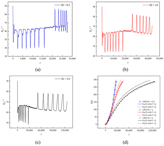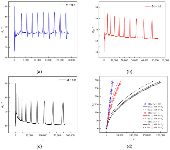 Figure 9a–c shows the time evolution of the DCA θd for different viscosity ratios M in the parabolic capillary. When M = 0.2, it can be seen that in the first half of the capillary, with the increase in imbibition time, the capillary width gradually decreases, and the viscous resistance also gradually decreases. Hence, the imbibition speed gradually increases, leading to the θd increases. And when the meniscus reaches the second half of the capillary, the capillary force gradually decreases due to the gradual increase in the capillary width. Still, the θd increases less due to a large amount of low-viscosity wetting fluid entering the capillary, leading to a smaller viscous drag. And when M = 1.0, the viscosity of both fluids is the same, and the imbibition rate depends on the change in capillary force. In the first half of the capillary, as the imbibition time increases, the capillary width gradually decreases, leading to an increase in the capillary pressure and, therefore, an increase in the imbibition rate leading to an increase in the value of the θd. In the second half of the capillary, the capillary width gradually increases, resulting in a decrease in capillary force and a corresponding decrease in imbibition velocity, resulting in a gradual reduction in the θd. On the contrary, for M = 5.0, θd can be increased briefly in the first half of the capillary, decreasing until the end of imbibition. This is because the viscous force of the wetting fluid dominates the imbibition process. Figure 9d shows the temporal evolution of imbibition length. It can be seen that the LW equation corrected for the DCA generally agrees with the LBM results, while the LW equation, without considering the DCA, cannot give an imbibition length consistent with LBM.