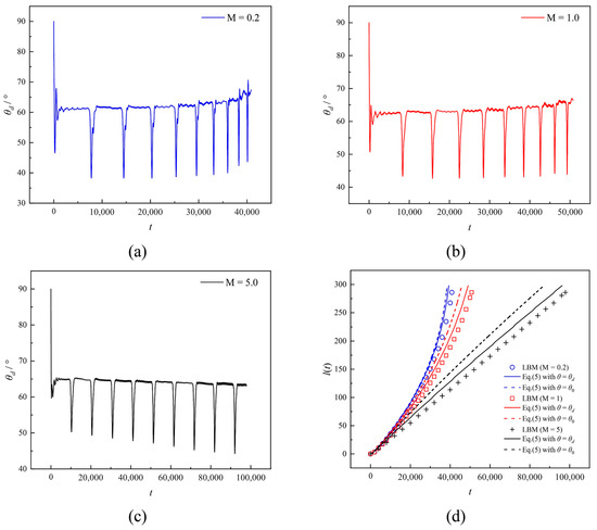 (a) Time evolution of dynamic contact angle for M = 0.2 in the monotonically divergent conical capillary. (b) Time evolution of dynamic contact angle for M = 1.0 in the monotonically divergent conical capillary. (c) Time evolution of dynamic contact angle for M = 5.0 in the monotonically divergent conical capillary. (d) Theoretical imbibition length with and without considering the dynamic contact angle with LBM results for different viscosity ratios.